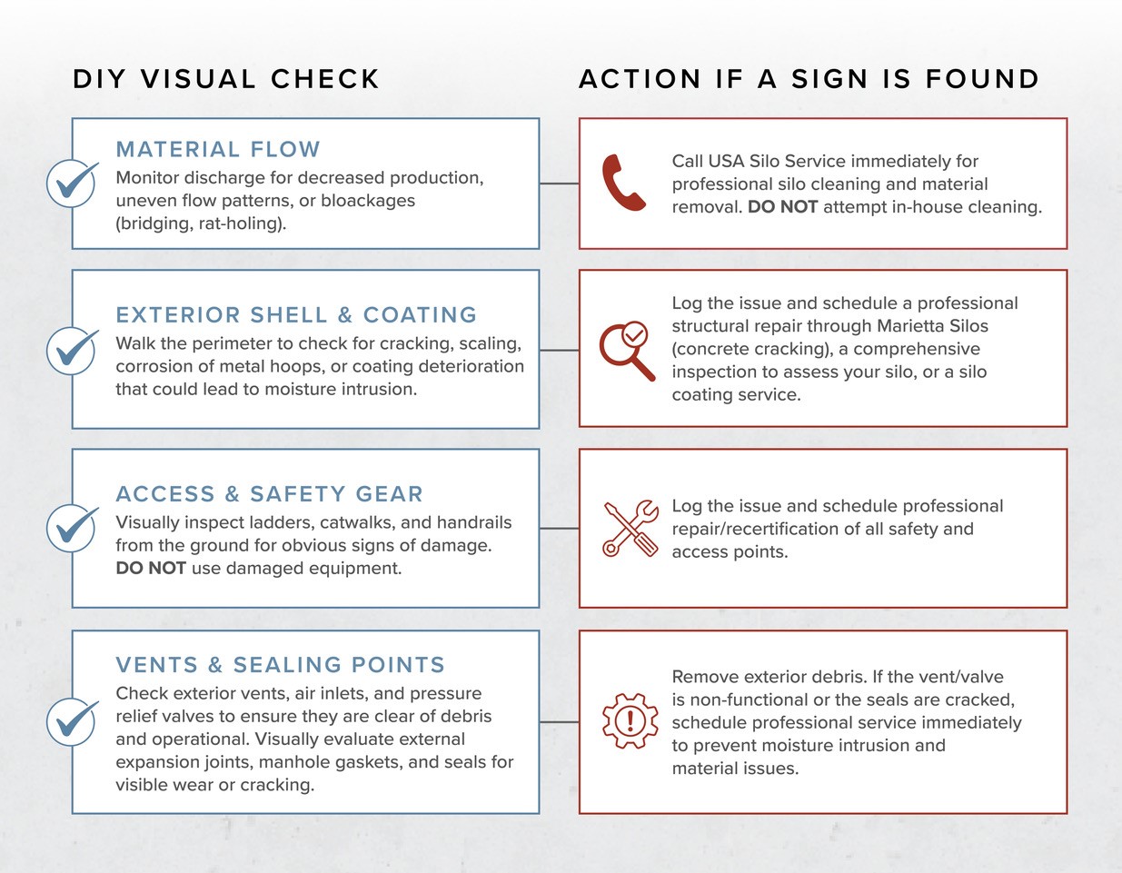 Want to make sure you're keeping up with your silo maintenance? Use this checklist to guide your team in safe, routine monitoring and know when to call USA Silo Service for professional cleaning, material removal, and critical component maintenance.