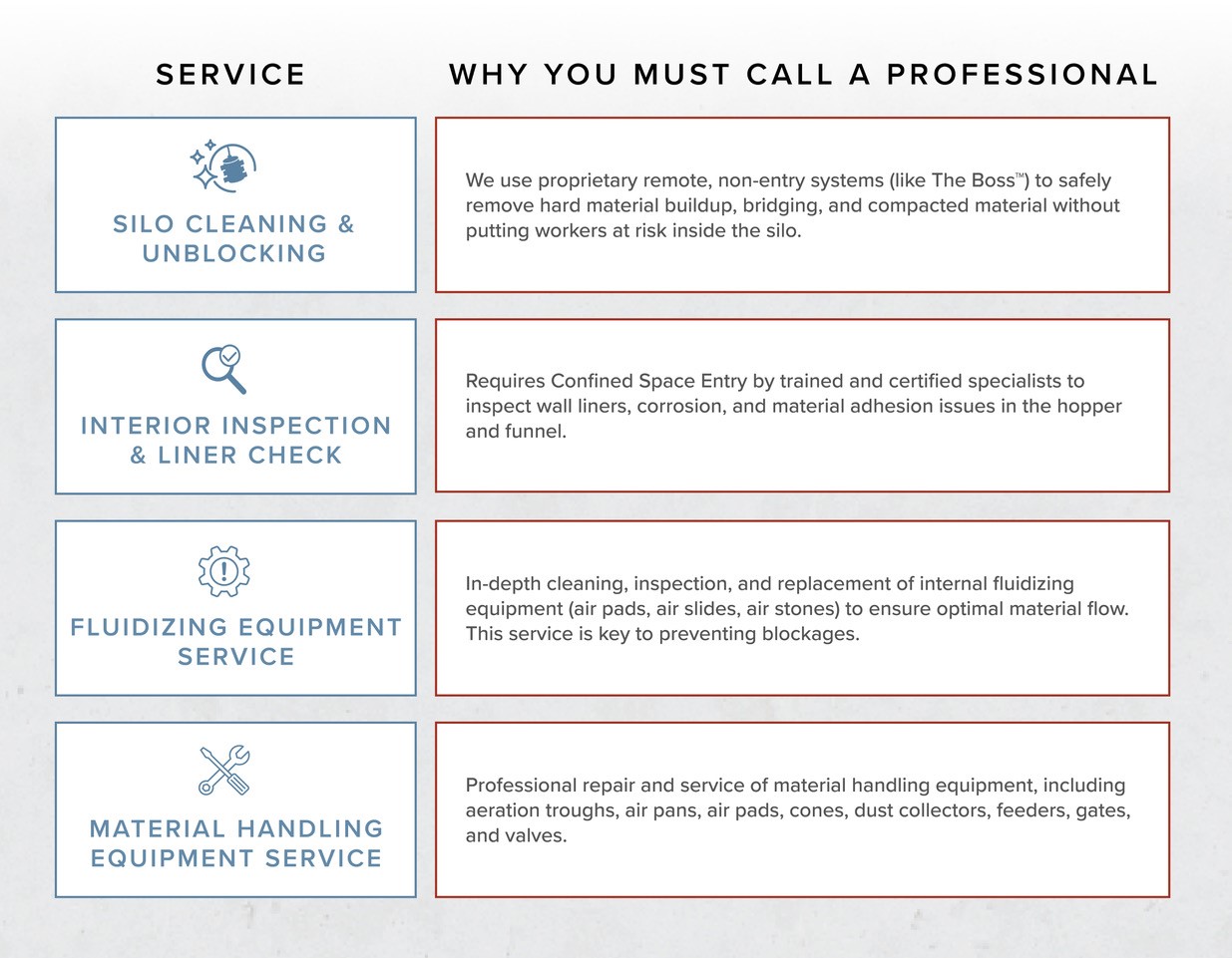 The following tasks involve Confined Space Entry, specialized equipment, or critical system maintenance. USA Silo Service professionals must be called for these services.